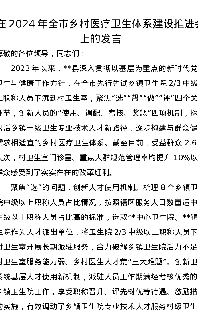 在2024年全市乡村医疗卫生体系建设推进会上的发言