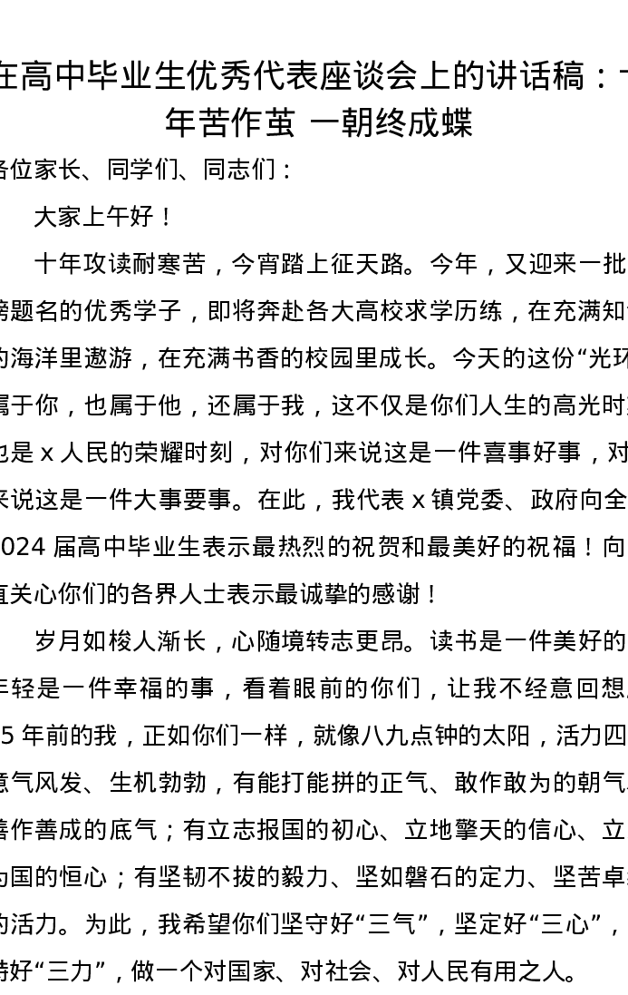 在高中毕业生优秀代表座谈会上的讲话稿:十年苦作茧,,一朝终成蝶
