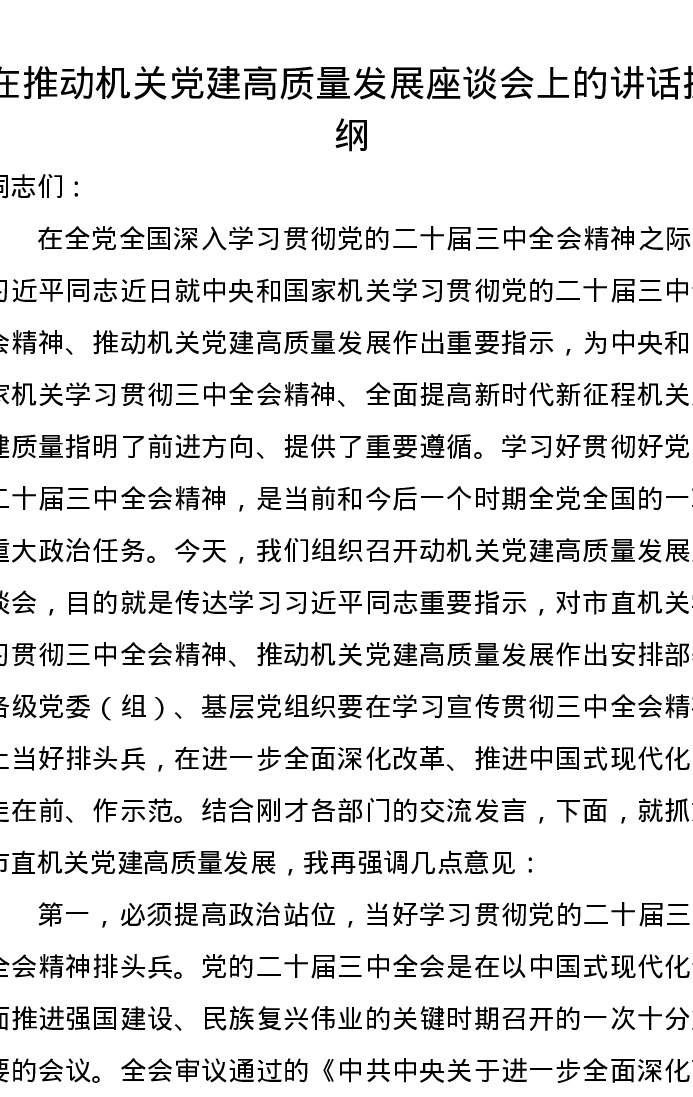 在推动机关党建高质量发展座谈会上的讲话提纲