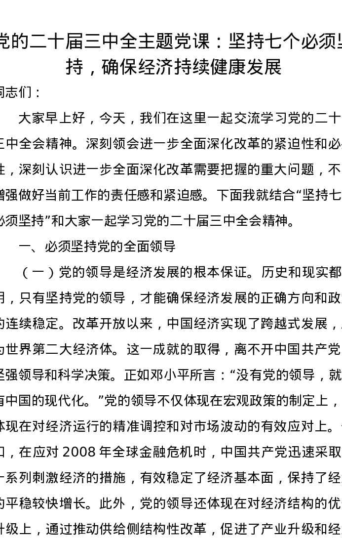 党的二十届三中全党课讲稿:坚持七个必须坚持,确保经济持续健康发展