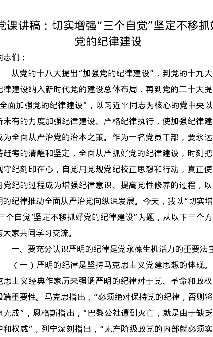 党课讲稿:切实增强“三个自觉”坚定不移抓好党的纪律建设