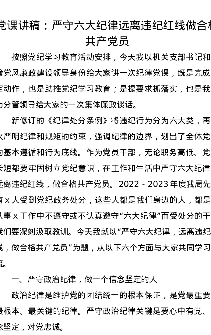 党课讲稿:严守六大纪律远离违纪红线做合格共产党员