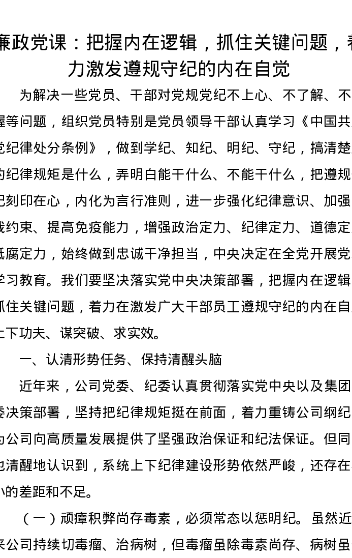 廉政党课讲稿:把握内在逻辑,抓住关键问题,着力激发遵规守纪的内在自觉