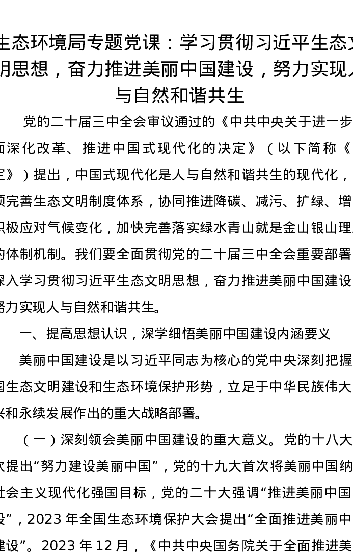 生态环境局专题党课:学习贯彻习近平生态文明思想,奋力推进美丽中国建设,努力实现人与自然和谐共生