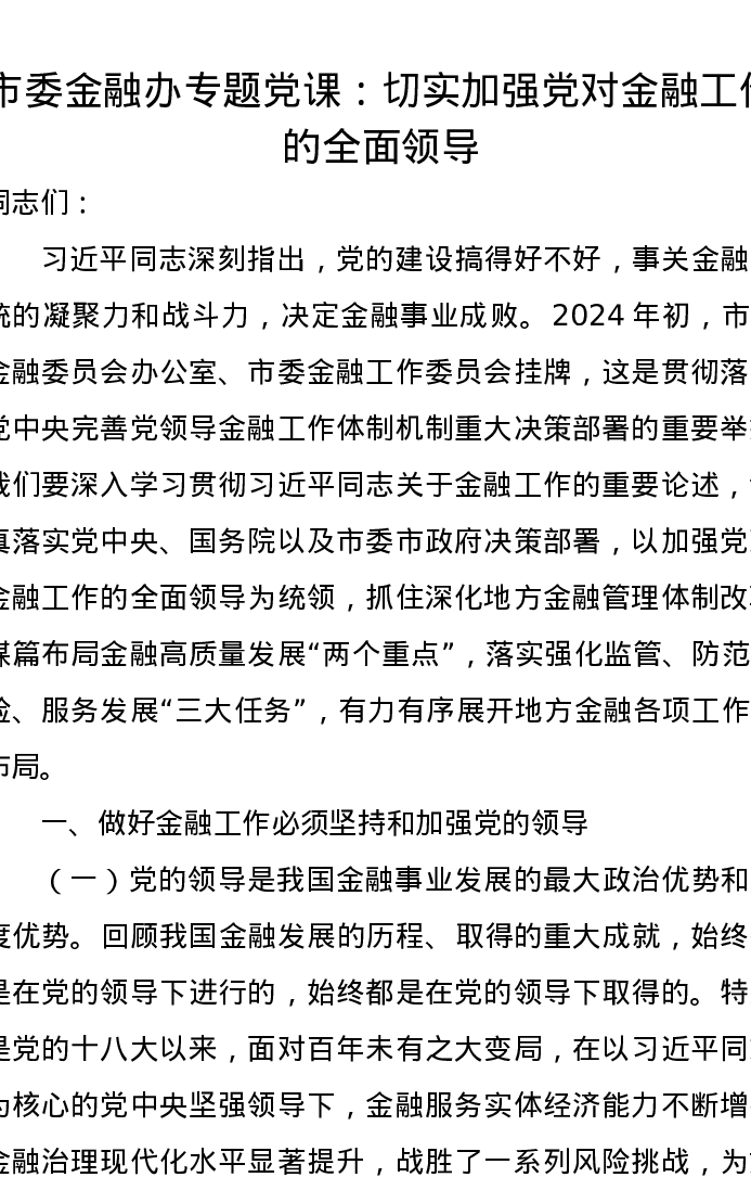 市委金融办专题党课讲稿:切实加强党对金融工作的全面领导