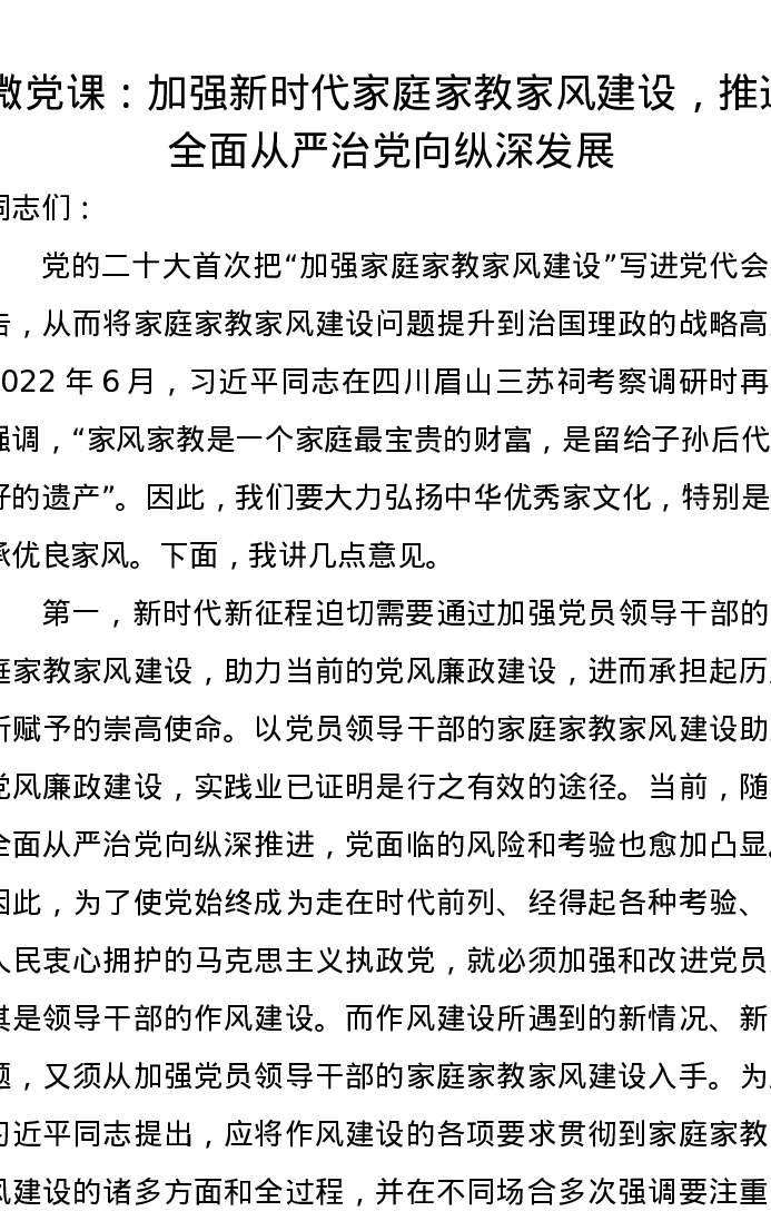 微党课:加强新时代家庭家教家风建设,推进全面从严治党向纵深发展