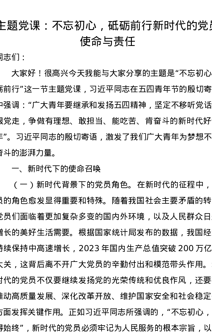 主题党课:不忘初心,砥砺前行新时代的党员使命与责任