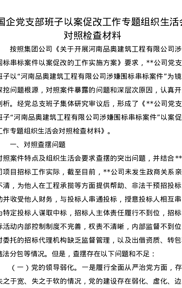 国企党支部班子以案促改工作专题组织生活会对照检查材料