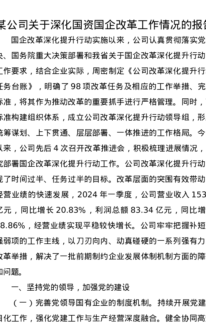 某公司关于深化国资国企改革工作情况的报告