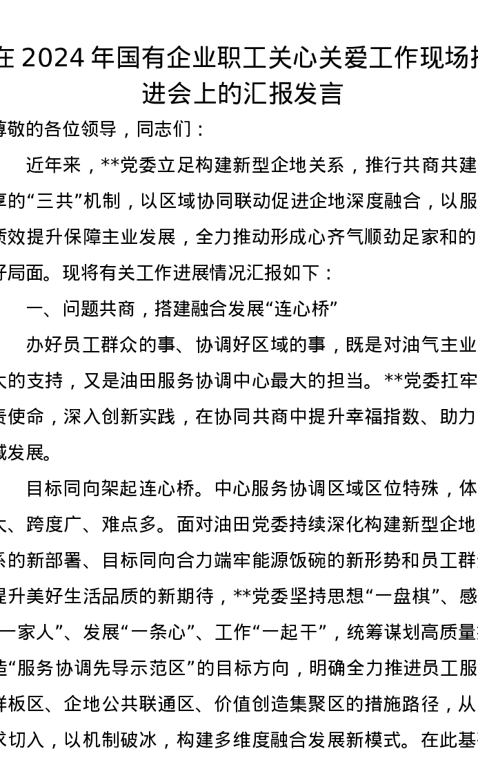 在2024年国有企业职工关心关爱工作现场推进会上的汇报发言