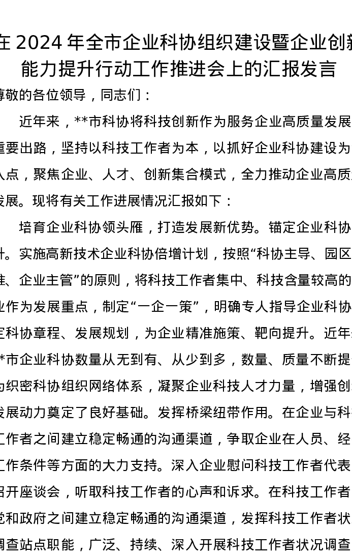 在2024年全市企业科协组织建设暨企业创新能力提升行动工作推进会上的汇报发言