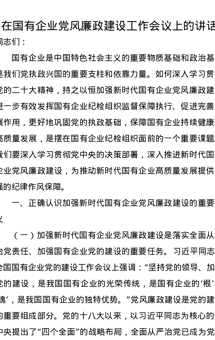 在国有企业党风廉政建设工作会议上的讲话