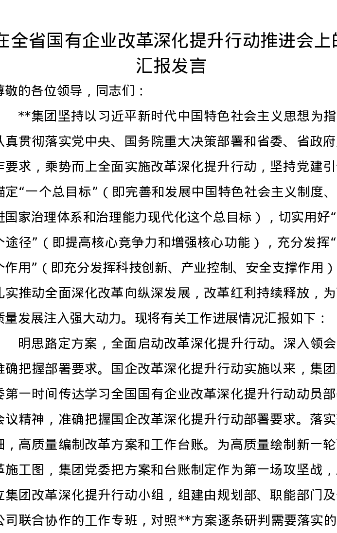 在全省国有企业改革深化提升行动推进会上的汇报发言