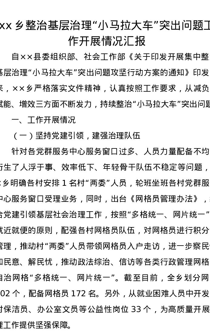 xx乡整治基层治理“小马拉大车”突出问题工作开展情况汇报