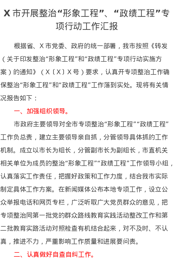 X市开展整治“形象工程”、“政绩工程”专项行动工作汇报