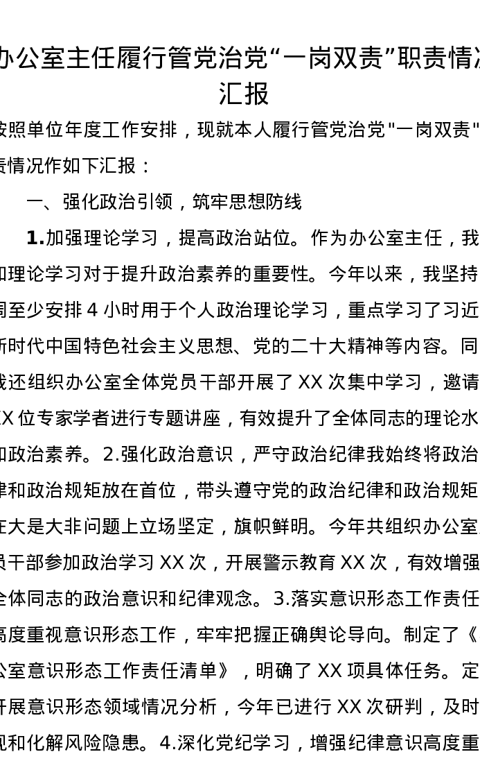 办公室主任履行管党治党“一岗双责”职责情况汇报