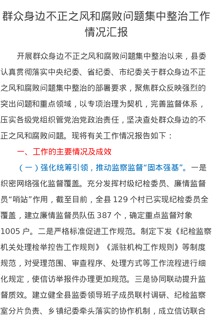 群众身边不正之风和腐败问题集中整治工作情况汇报