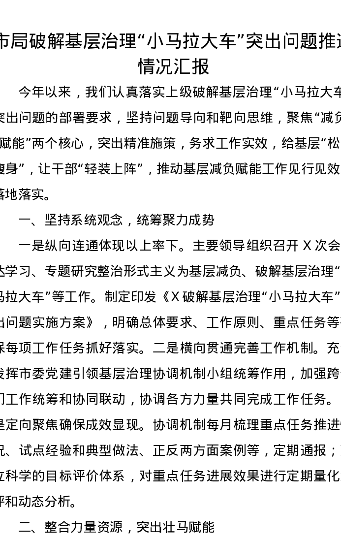 市局破解基层治理“小马拉大车”突出问题推进情况汇报