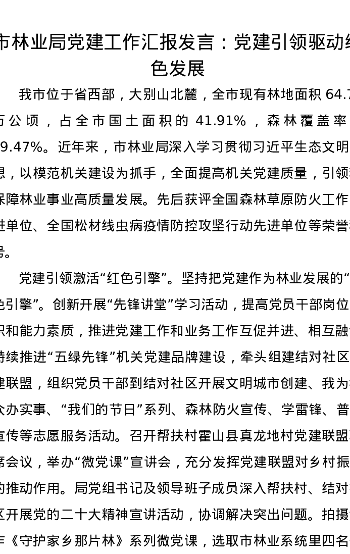 市林业局党建工作汇报发言:党建引领驱动绿色发展