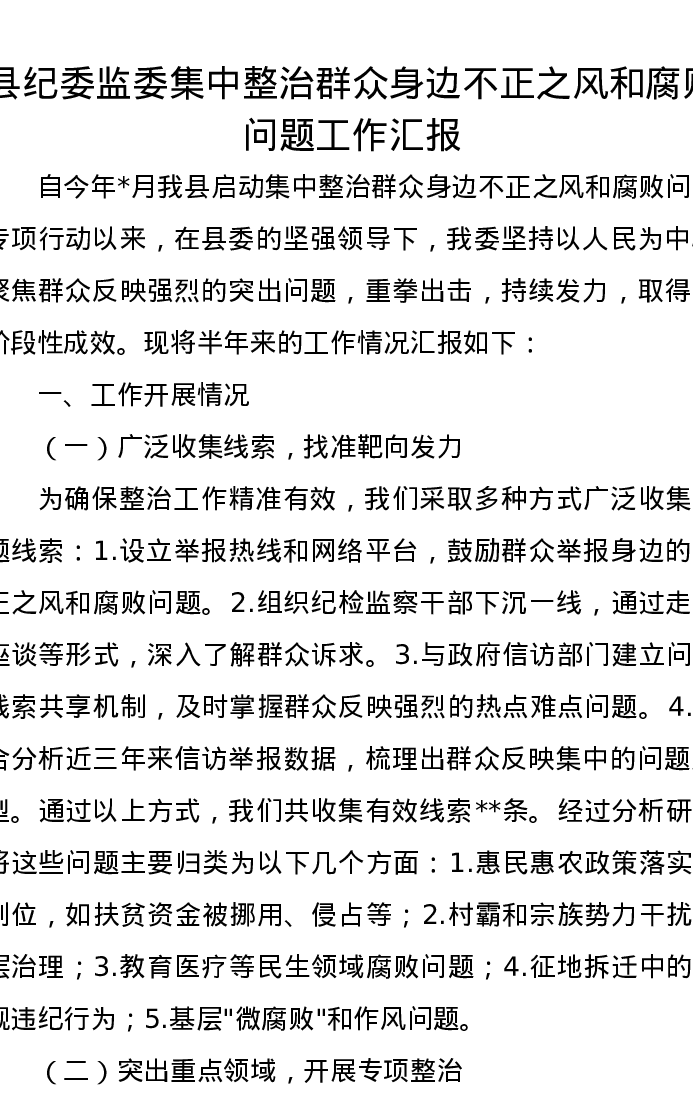 县纪委监委集中整治群众身边不正之风和腐败问题工作汇报