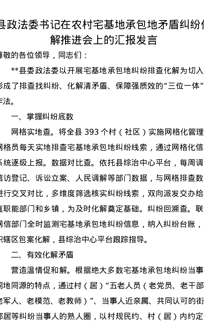 县政法委书记在农村宅基地承包地矛盾纠纷化解推进会上的汇报发言