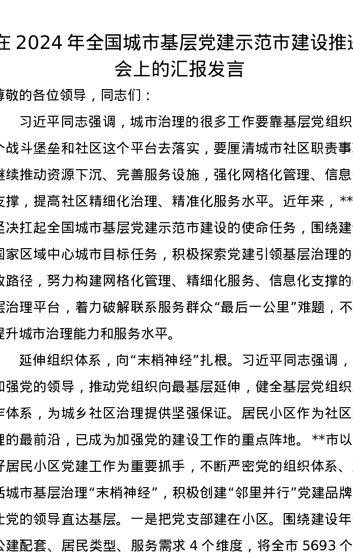 在2024年全国城市基层党建示范市建设推进会上的汇报发言