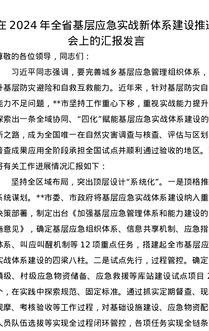 在2024年全省基层应急实战新体系建设推进会上的汇报发言