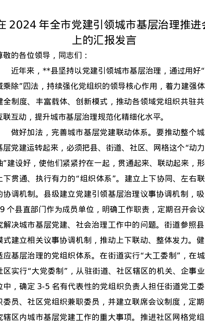 在2024年全市党建引领城市基层治理推进会上的汇报发言
