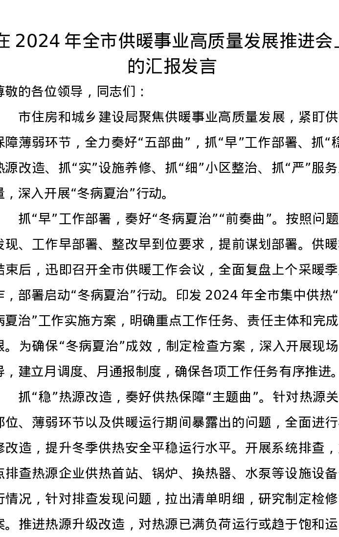 在2024年全市供暖事业高质量发展推进会上的汇报发言