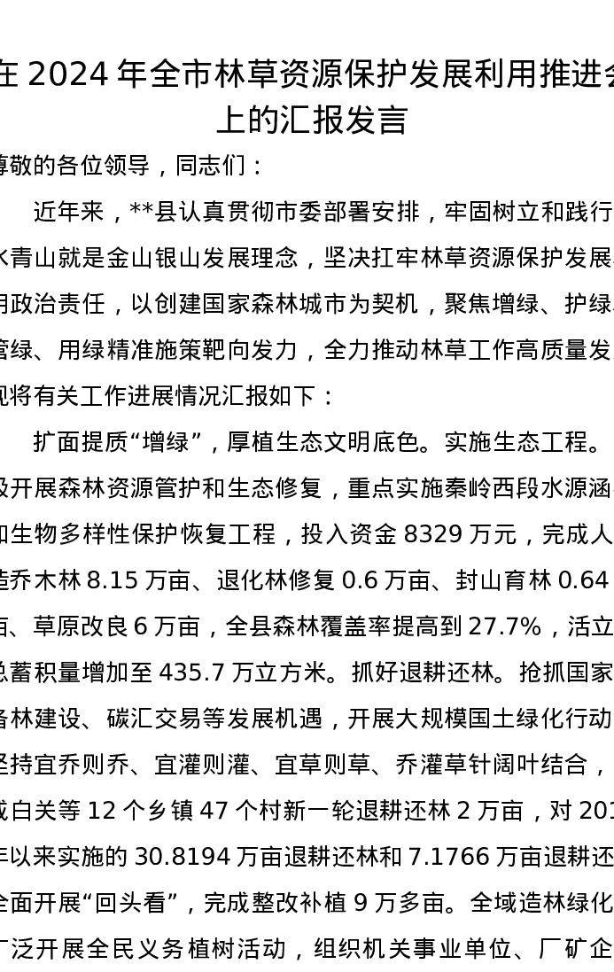 在2024年全市林草资源保护发展利用推进会上的汇报发言