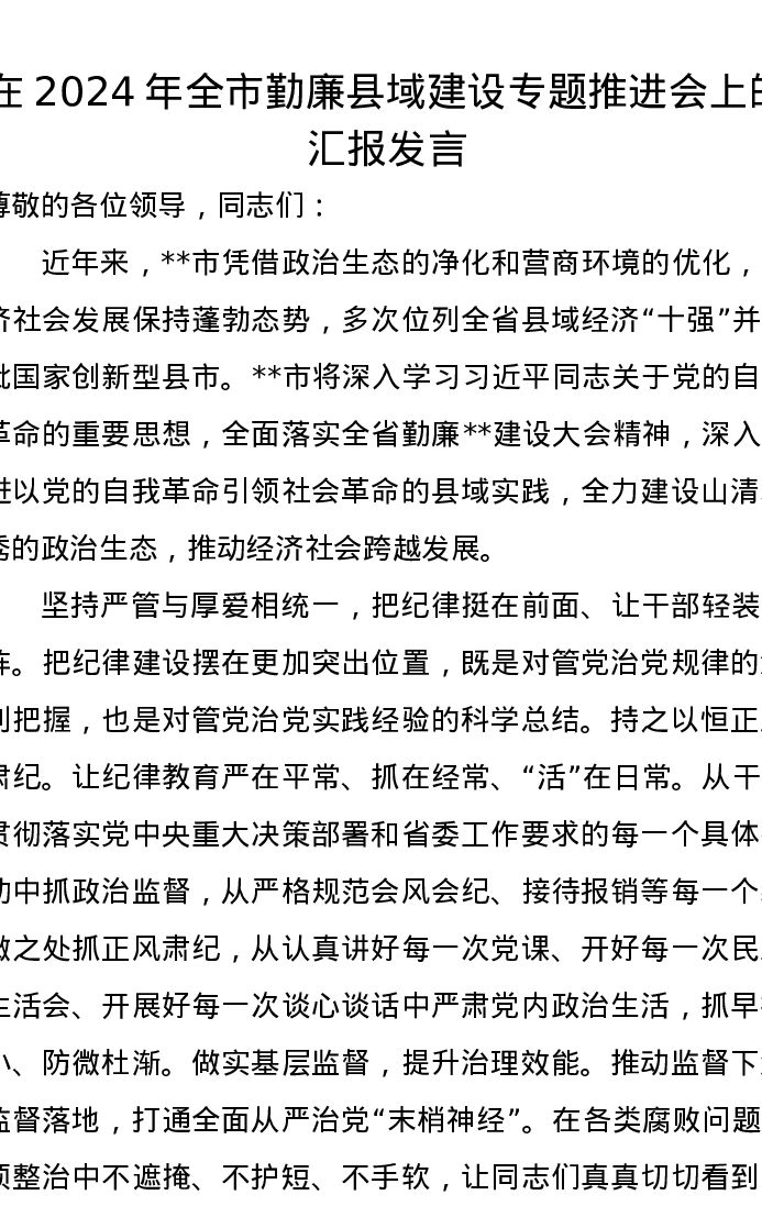 在2024年全市勤廉县域建设专题推进会上的汇报发言