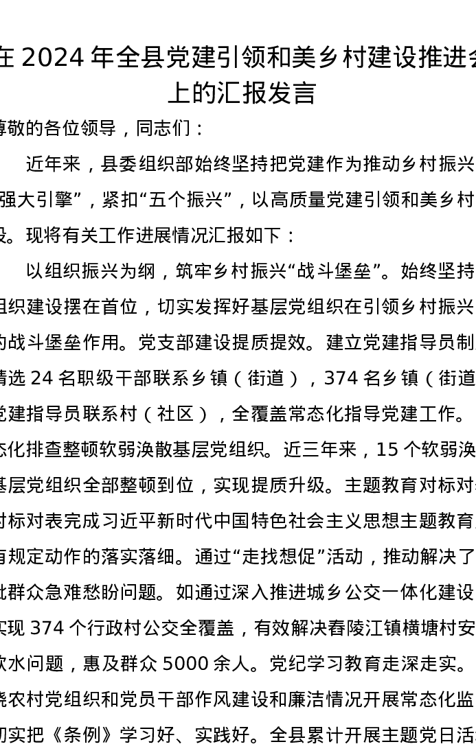 在2024年全县党建引领和美乡村建设推进会上的汇报发言