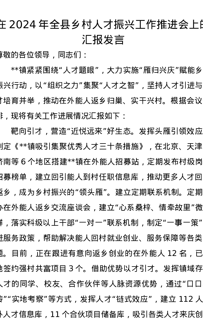 在2024年全县乡村人才振兴工作推进会上的汇报发言