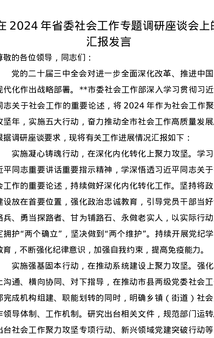 在2024年省委社会工作专题调研座谈会上的汇报发言