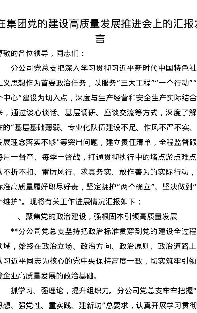 在集团党的建设高质量发展推进会上的汇报发言