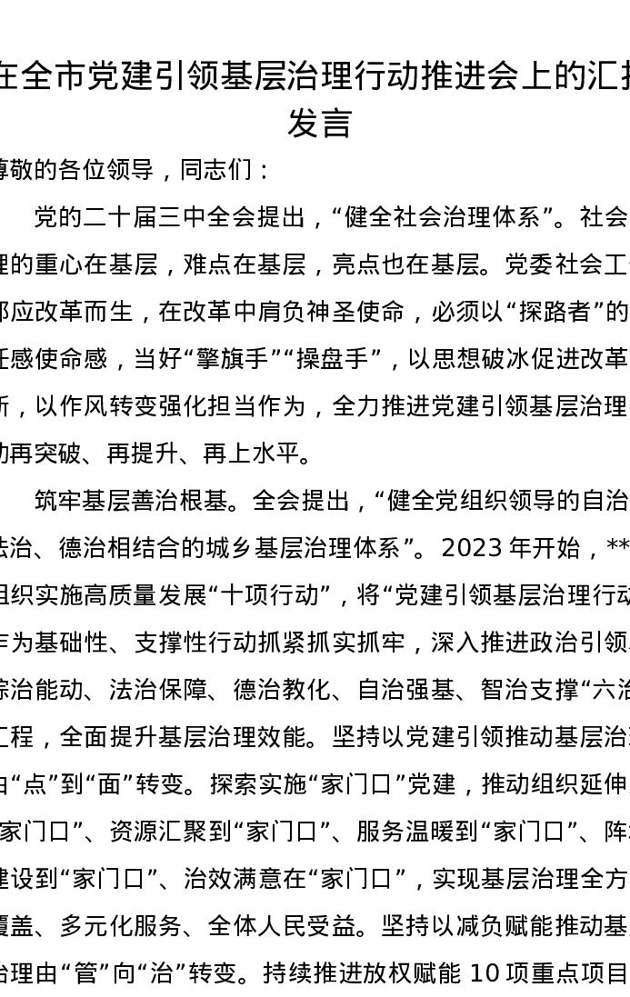 在全市党建引领基层治理行动推进会上的汇报发言