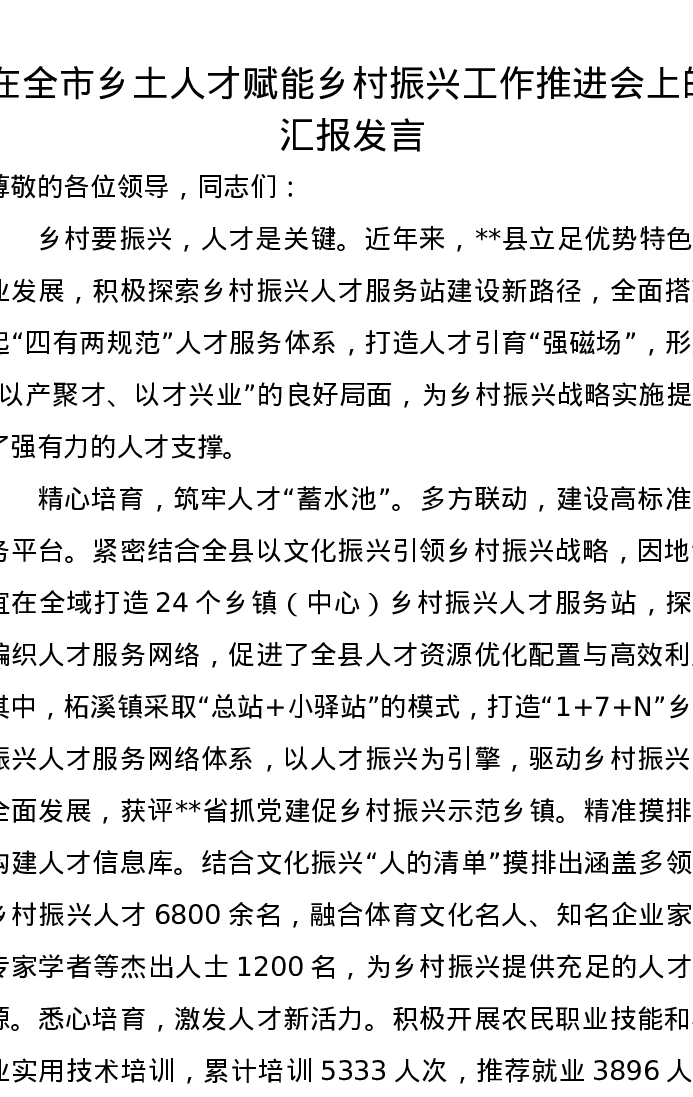 在全市乡土人才赋能乡村振兴工作推进会上的汇报发言