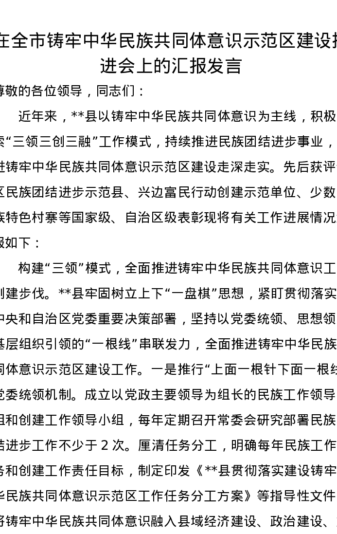 在全市铸牢中华民族共同体意识示范区建设推进会上的汇报发言