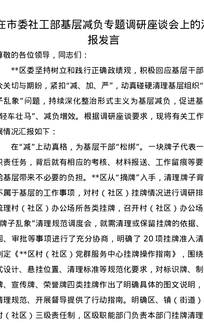 在市委社工部基层减负专题调研座谈会上的汇报发言