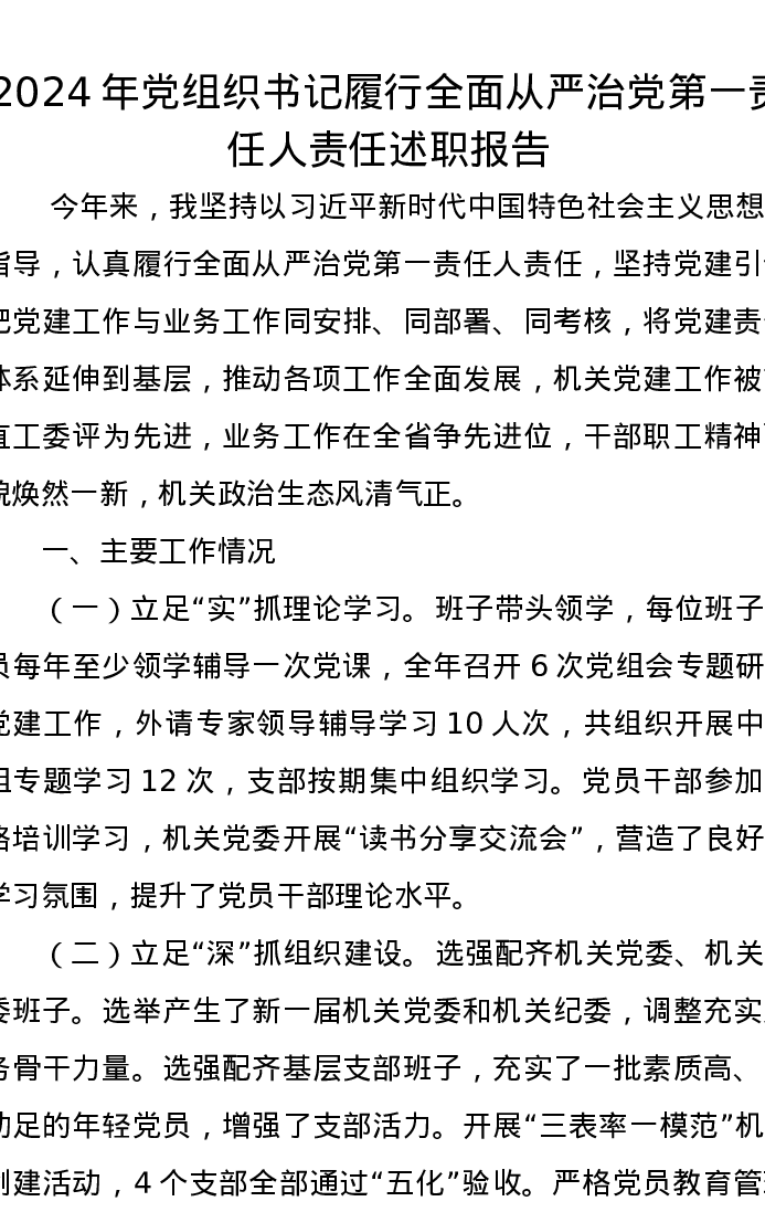 2024年党组织书记履行全面从严治党第一责任人责任述职报告
