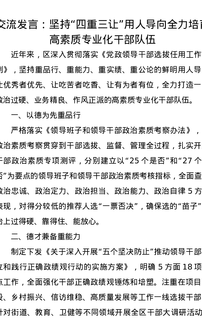 交流发言:坚持“四重三让”用人导向全力培育高素质专业化干部队伍
