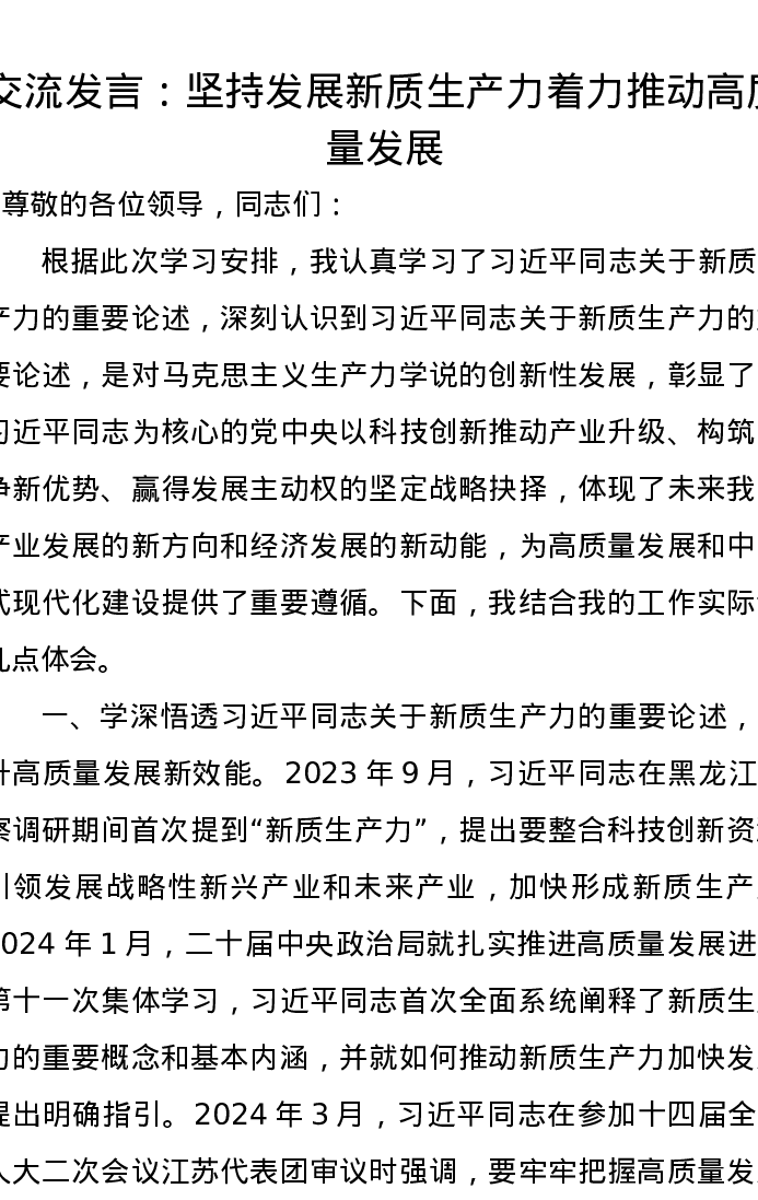 交流发言:坚持发展新质生产力着力推动高质量发展