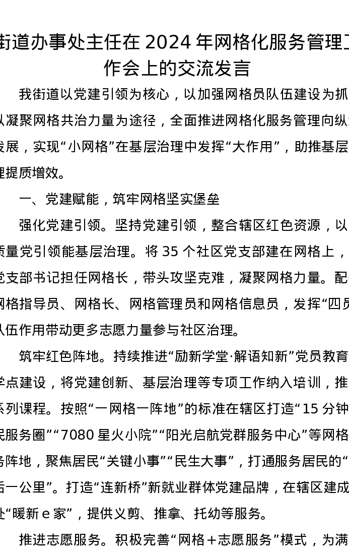 街道办事处主任在2024年网格化服务管理工作会上的交流发言
