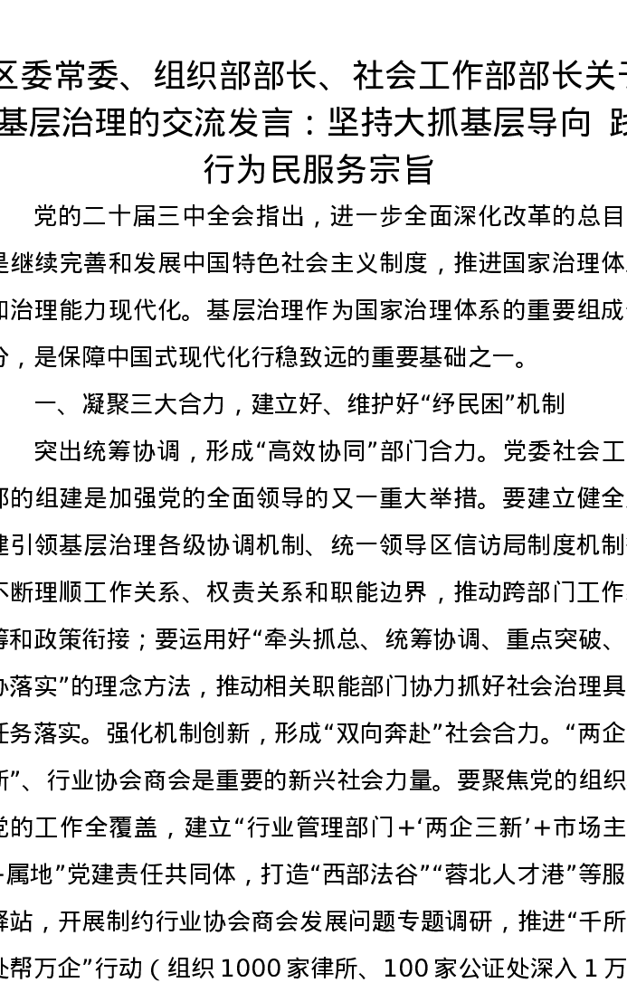 区委常委、组织部部长、社会工作部部长关于基层治理的交流发言:坚持大抓基层导向践行为民服务宗旨