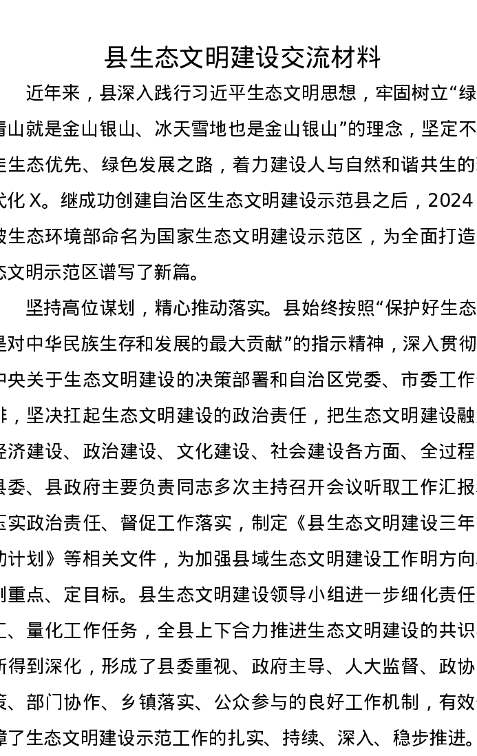 县生态文明建设交流发言材料