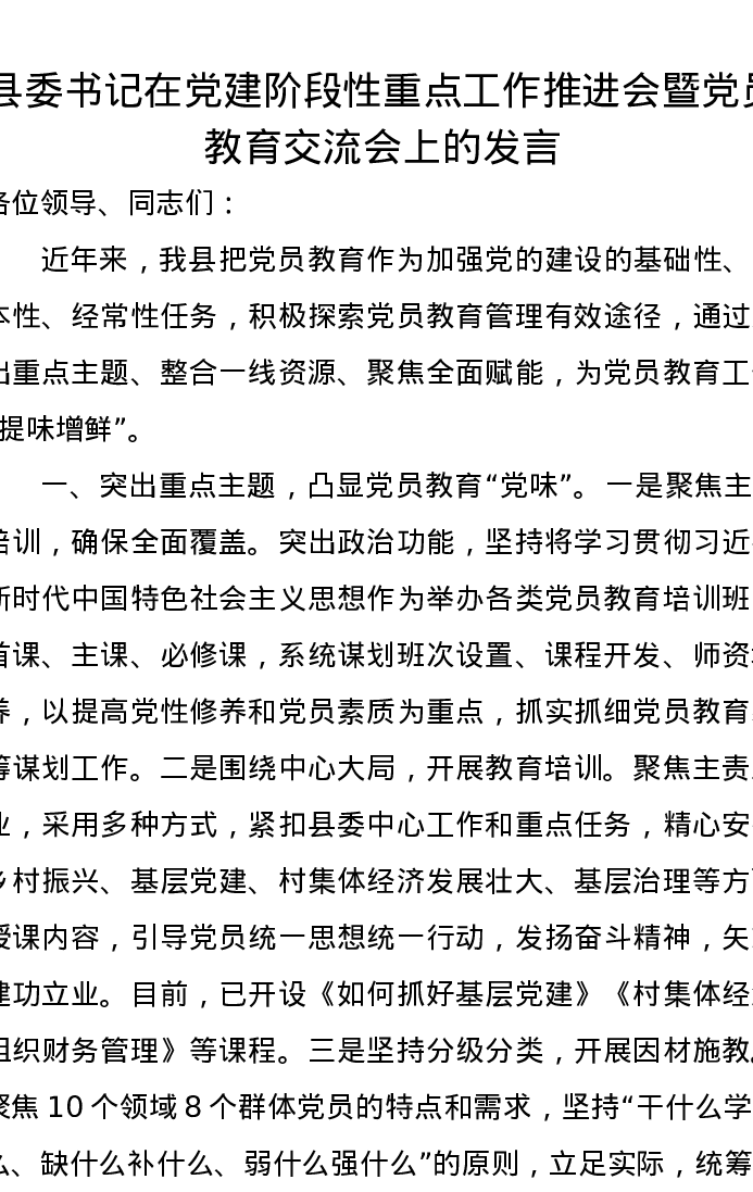 县委书记在党建阶段性重点工作推进会暨党员教育交流会上的发言