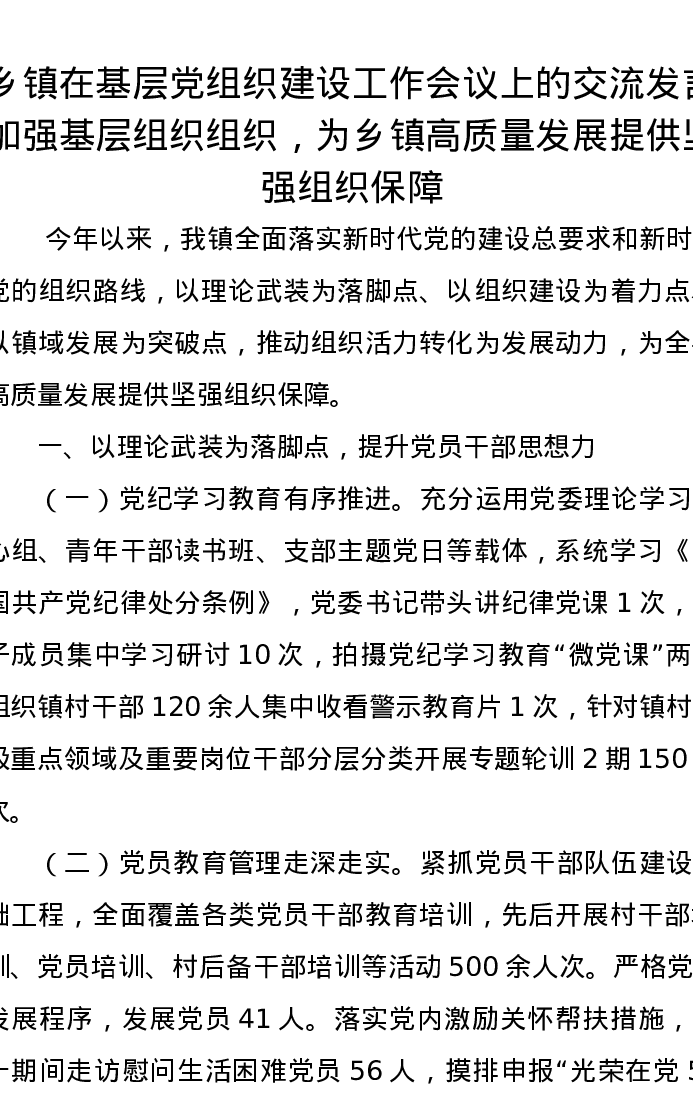 乡镇在基层党组织建设工作会议上的交流发言:加强基层组织组织,为乡镇高质量发展提供坚强组织保障