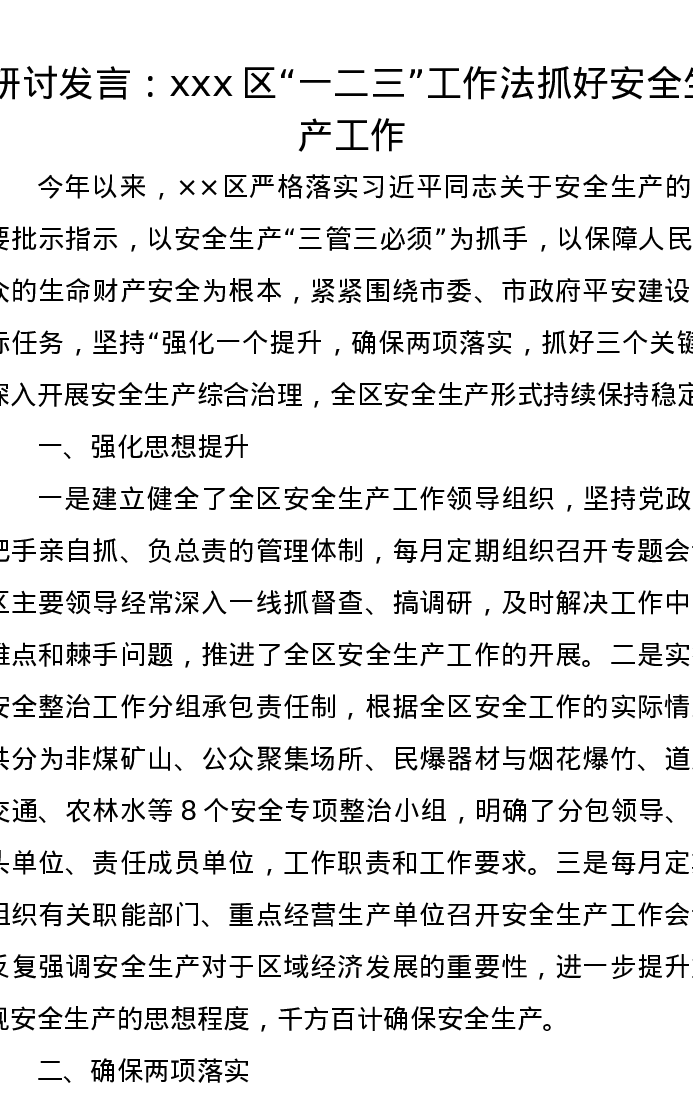 研讨发言:xxx区“一二三”工作法抓好安全生产工作
