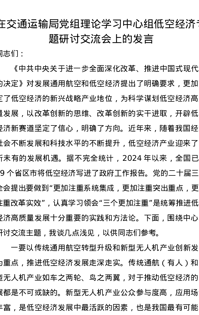 在交通运输局党组理论学习中心组低空经济专题研讨交流会上的发言