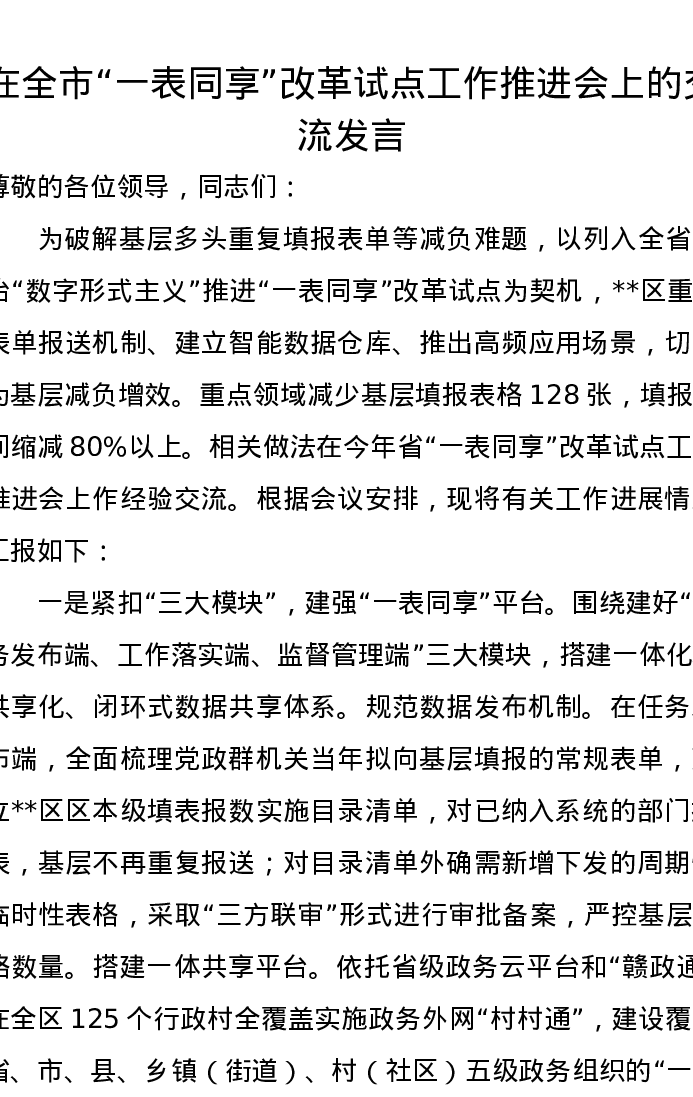在全市“一表同享”改革试点工作推进会上的交流发言